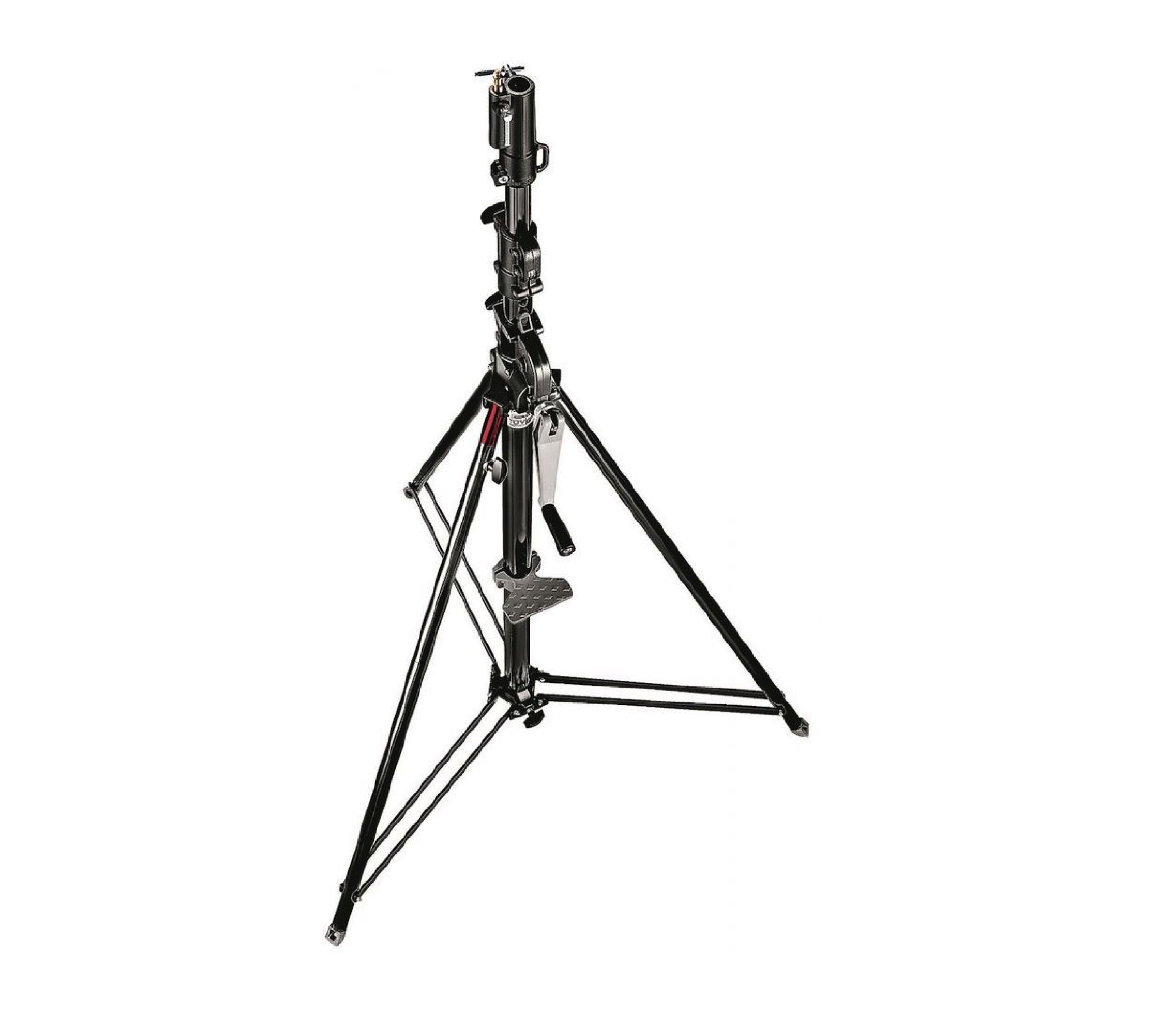 Manfrotto 087NWB wind up 3-section black zinc. Black steel stand with geared column. 2 risers extend simultaneously at an elevation of 1.75 inches per handle turn.